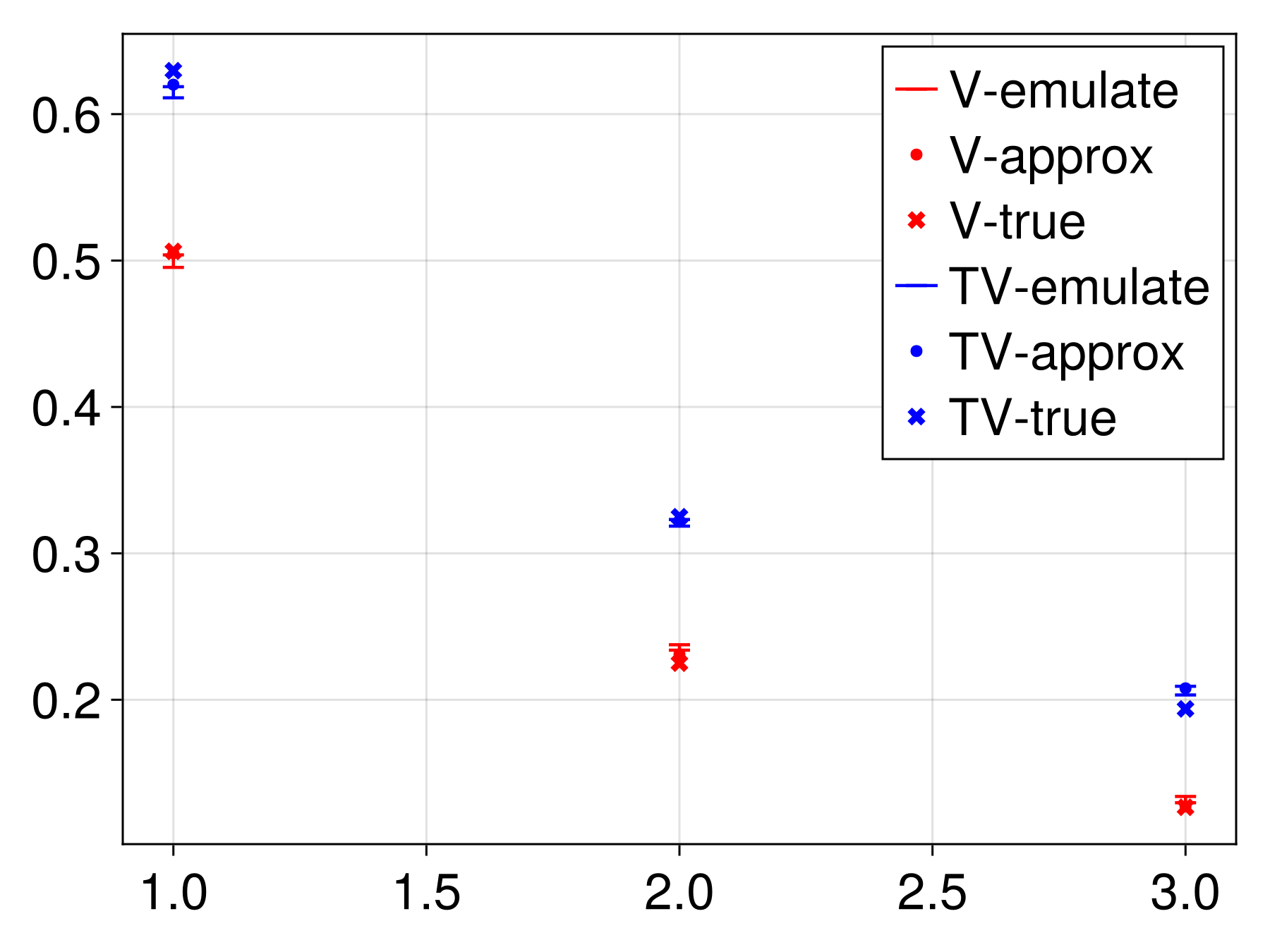 For three input dimensions, one obtains the following plot of the analytic indices (X-true), qMC-approximated with true function (X-approx), and the 95% confidence interval of the qMC-approximated with emulator (X-emulate).