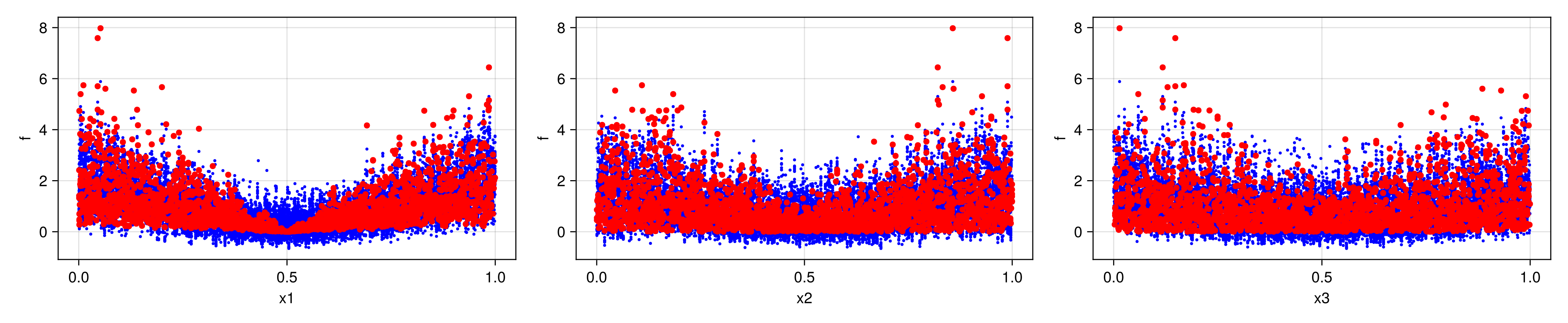 using CalibrateEmulateSample.EnsembleKalmanProcesses # for `DataMisfitController`We set up the sampling procedure, evaluate the true ishigami function on these points, and calculate the sobol indices