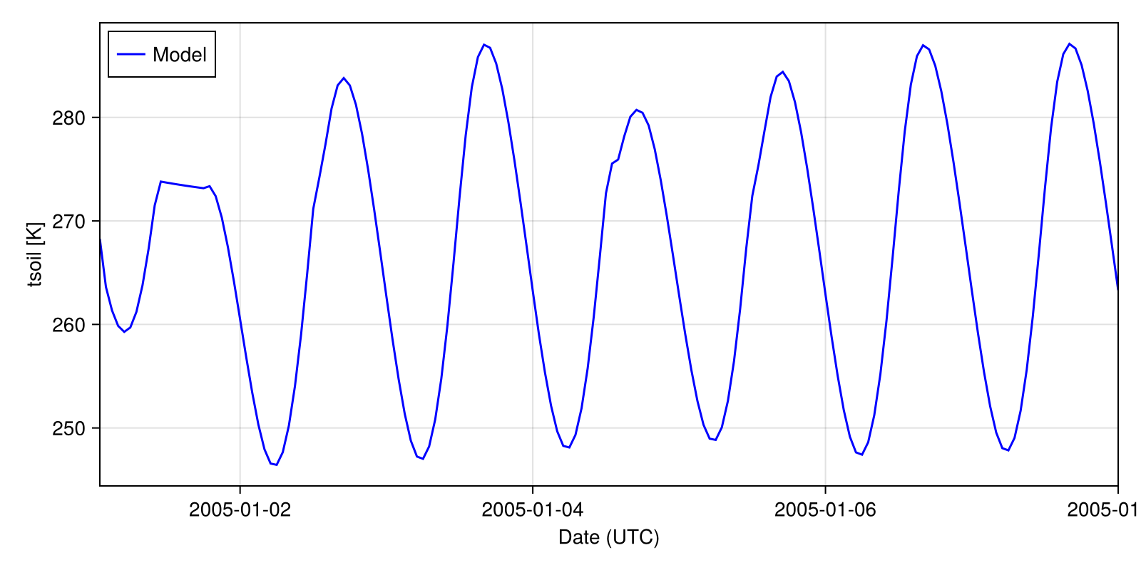 T_atmos = (t) -> 275.0 + 5.0 * sin(2.0 * π * FT(t) / 86400 - π / 2);Constant otherwise: