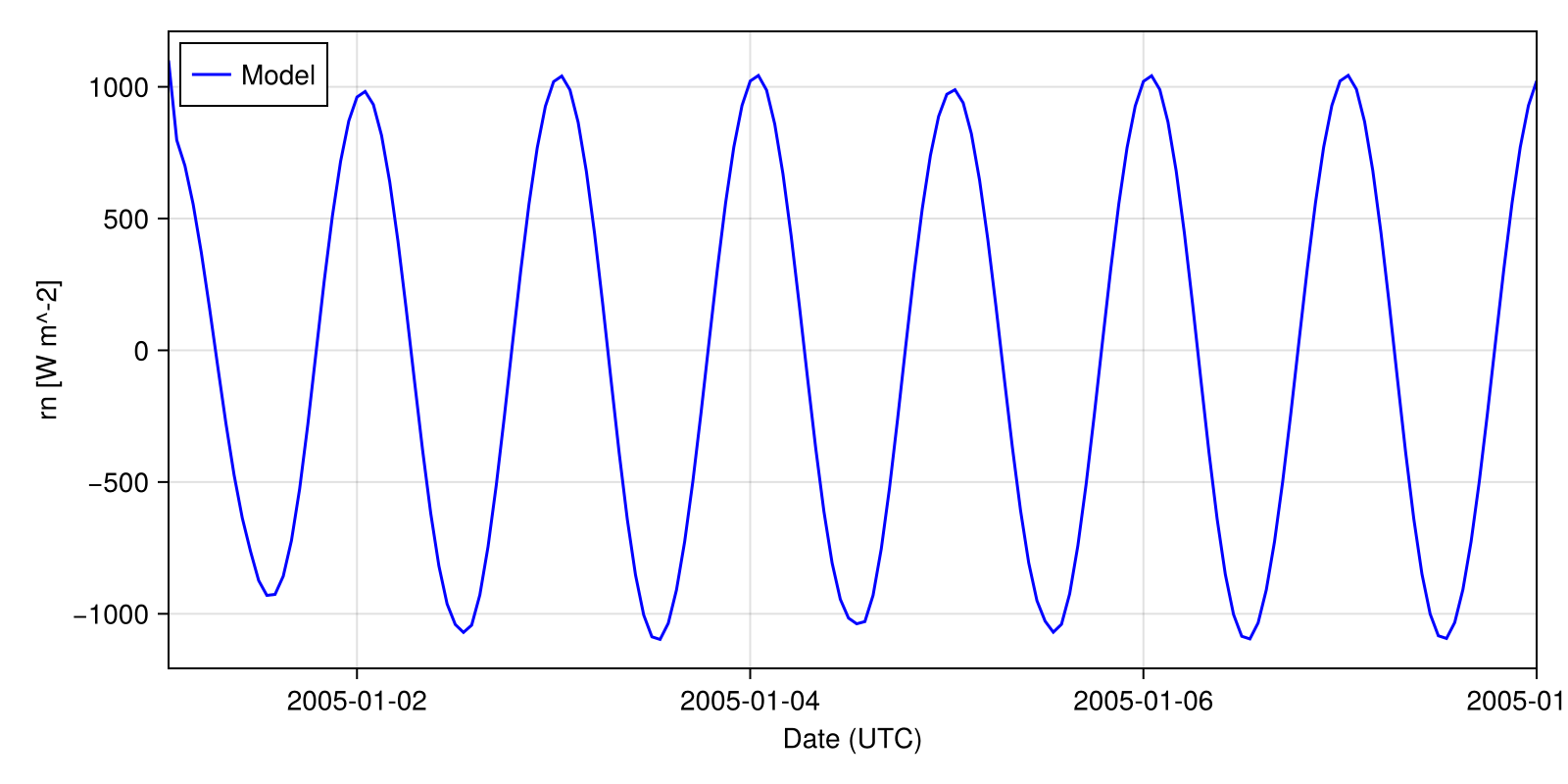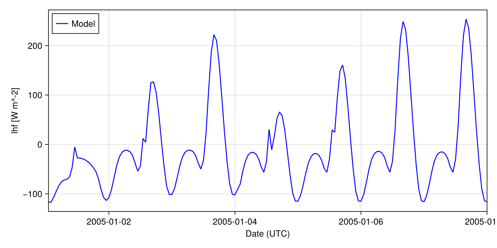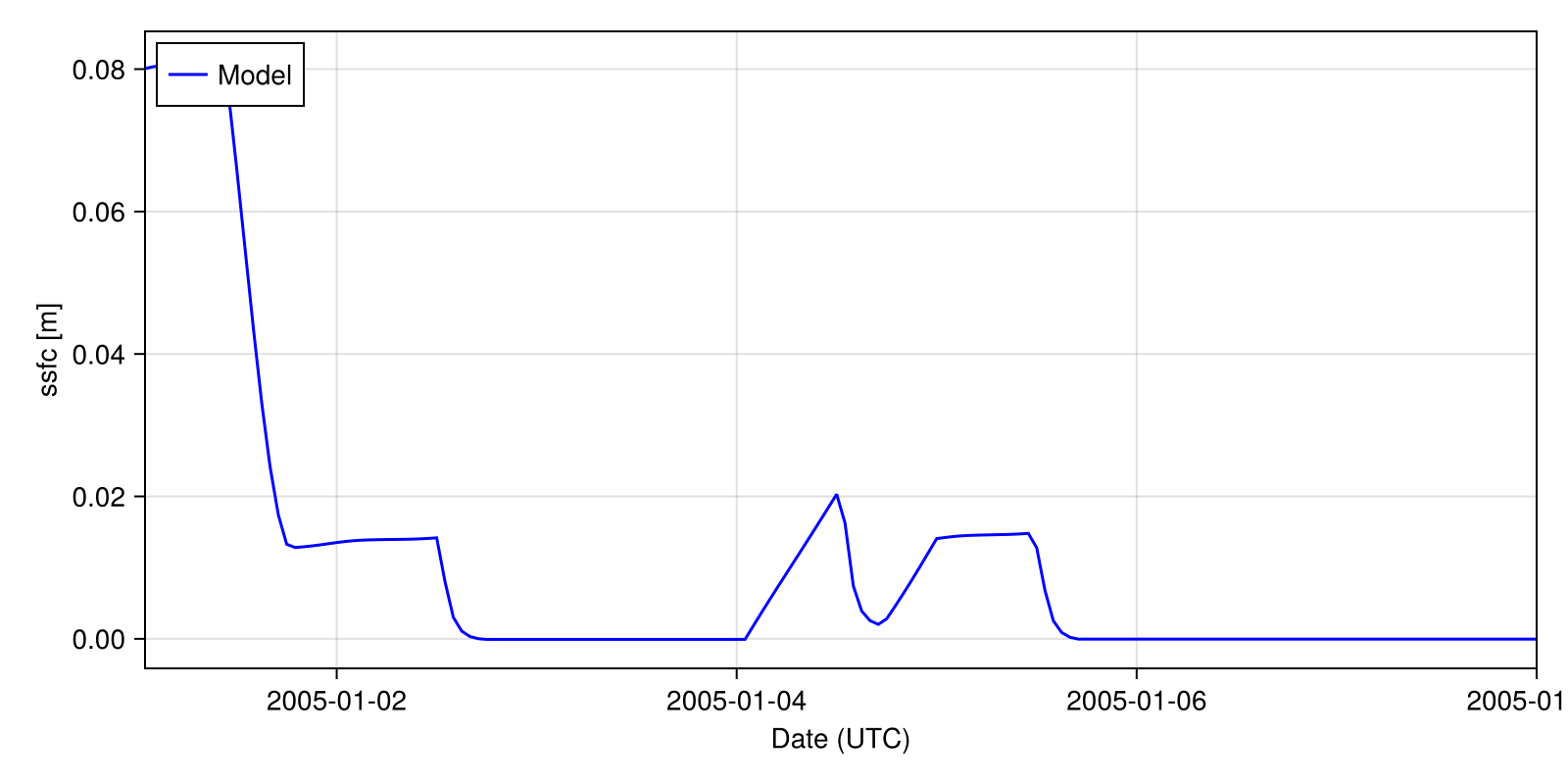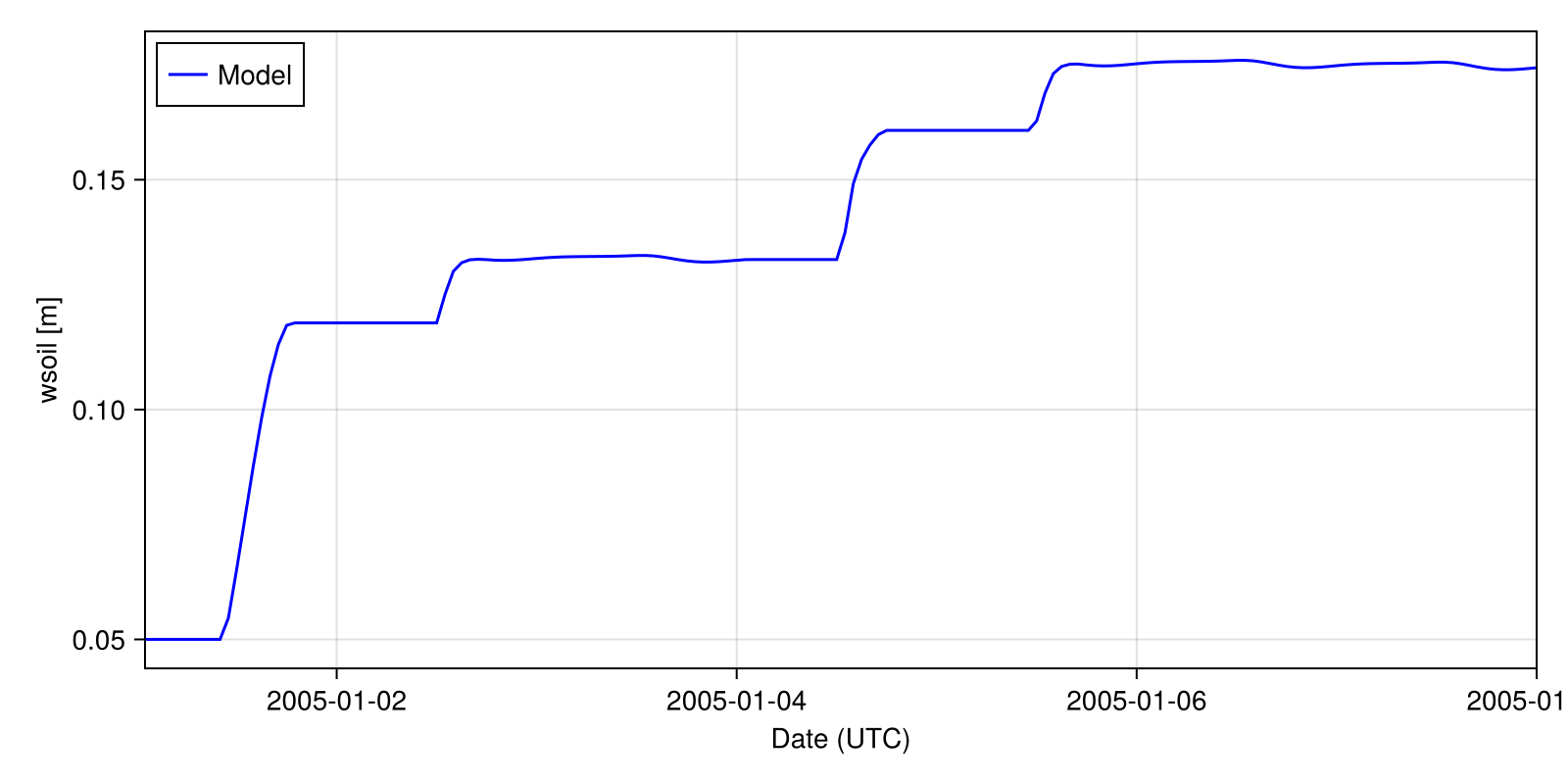 Y.bucket |> propertynames(:W, :T, :Ws, :σS)The auxiliary variables in this case are the surface temperature, the turbulent fluxes, the net radiation, and the surface specific humidity.