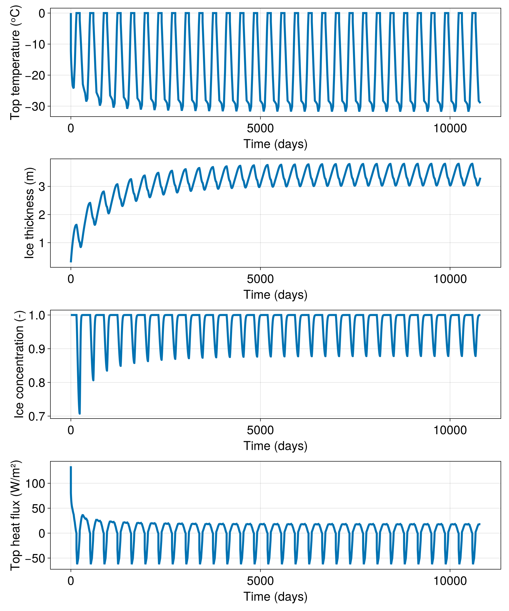 axh = Axis(fig[2, 1], xlabel="Time (days)", ylabel="Ice thickness (m)")