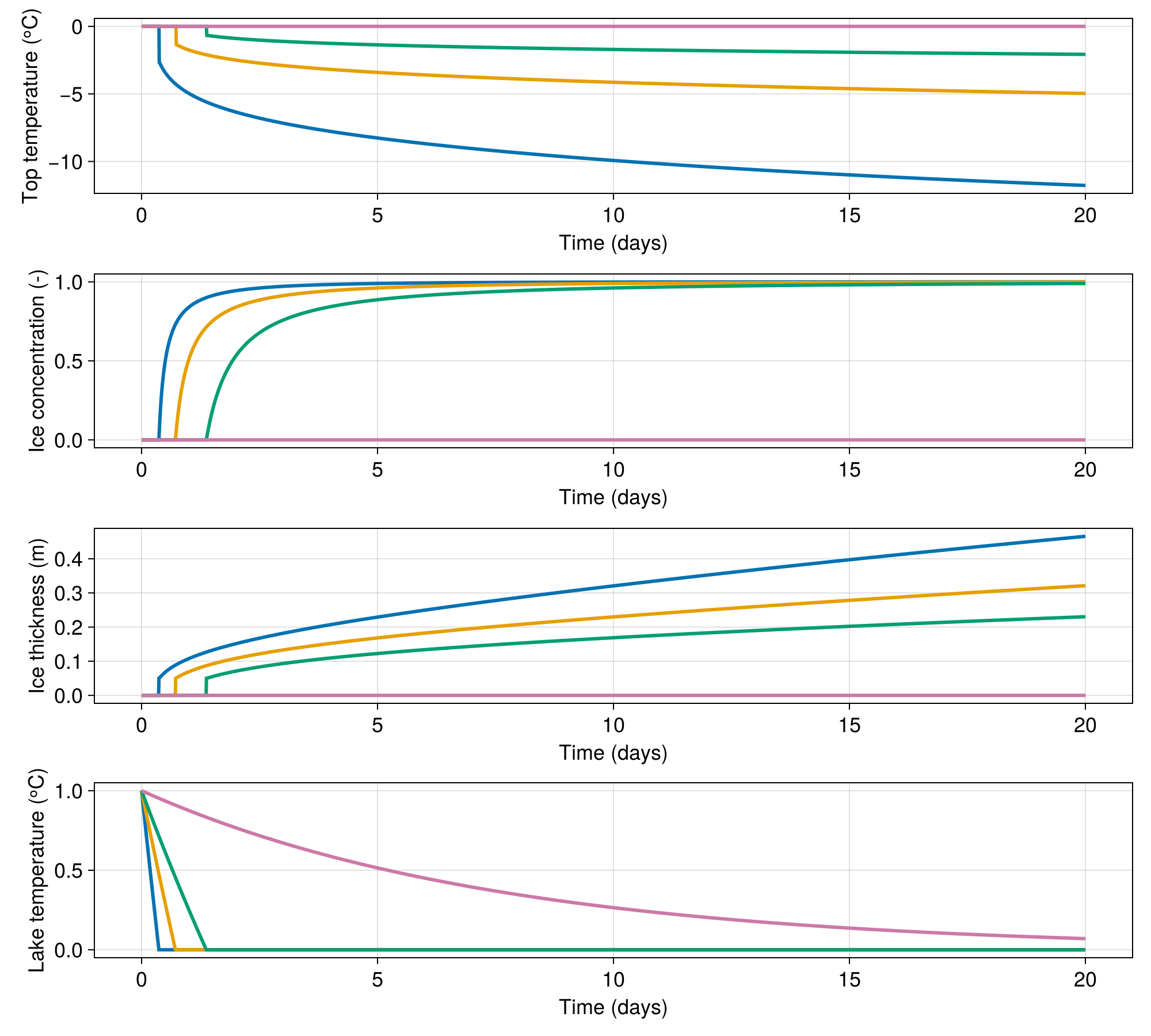 In this example we simulate the freezing of a lake in winter. The lake is represented by four points that start at 1ᵒC and are cooled down by an atmosphere with temperatures of -20, -10, -1, and -0.1ᵒC. The lake is 10 m deep and not subjected to radiative transfer (this lake is covered in a wind tunnel under which we blow some cold air).