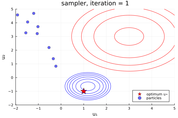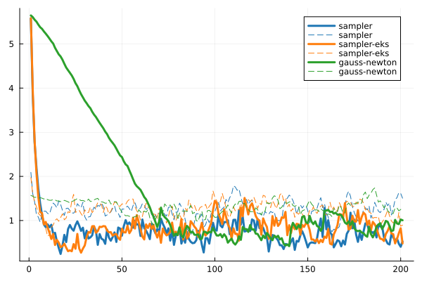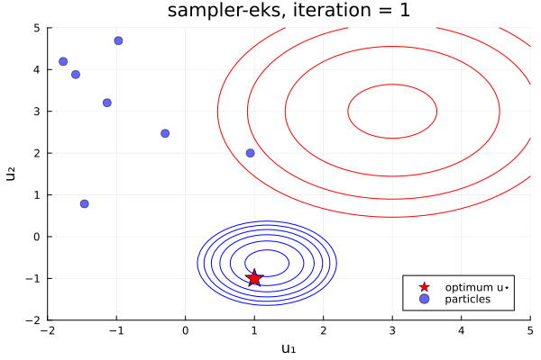 eksobj = EnsembleKalmanProcess(initial_ensemble, y, obs_noise_cov, Sampler(prior))One can also build the original EKS variant (not ALDI), with the sampler_type keyword