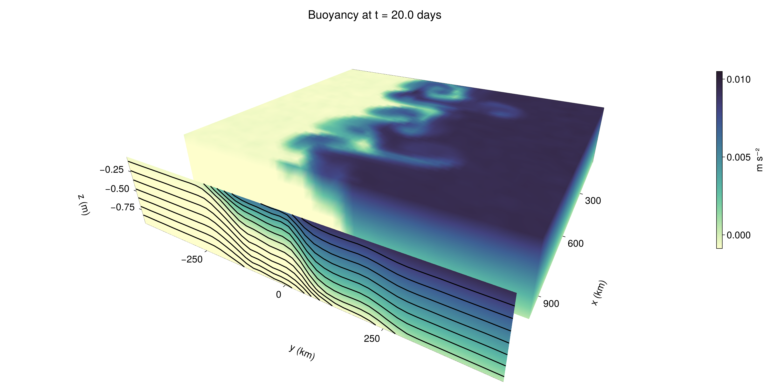 In this example, we simulate the evolution and equilibration of a baroclinically unstable front.