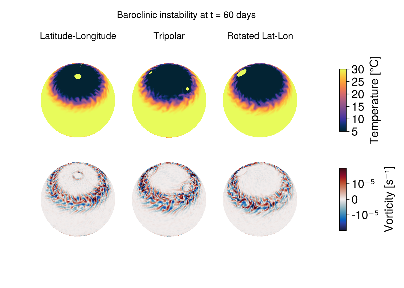 This example illustrates how to set up and run simulations of baroclinic instability on a spherical domain using three different spherical grid configurations: a standard latitude-longitude grid, a tripolar grid, and a rotated latitude-longitude grid.