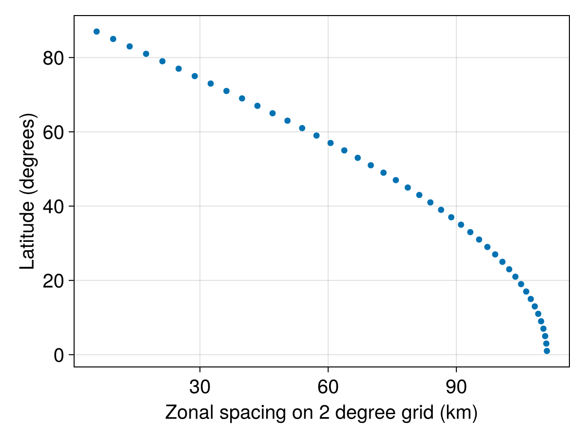 └── z: Bounded z ∈ [-1000.0, 0.0] regularly spaced with Δz=200.0The main difference between the syntax for LatitudeLongitudeGrid versus that for the RectilinearGrid are the names of the horizontal coordinates: LatitudeLongitudeGrid has longitude and latitude where RectilinearGrid has x and y.