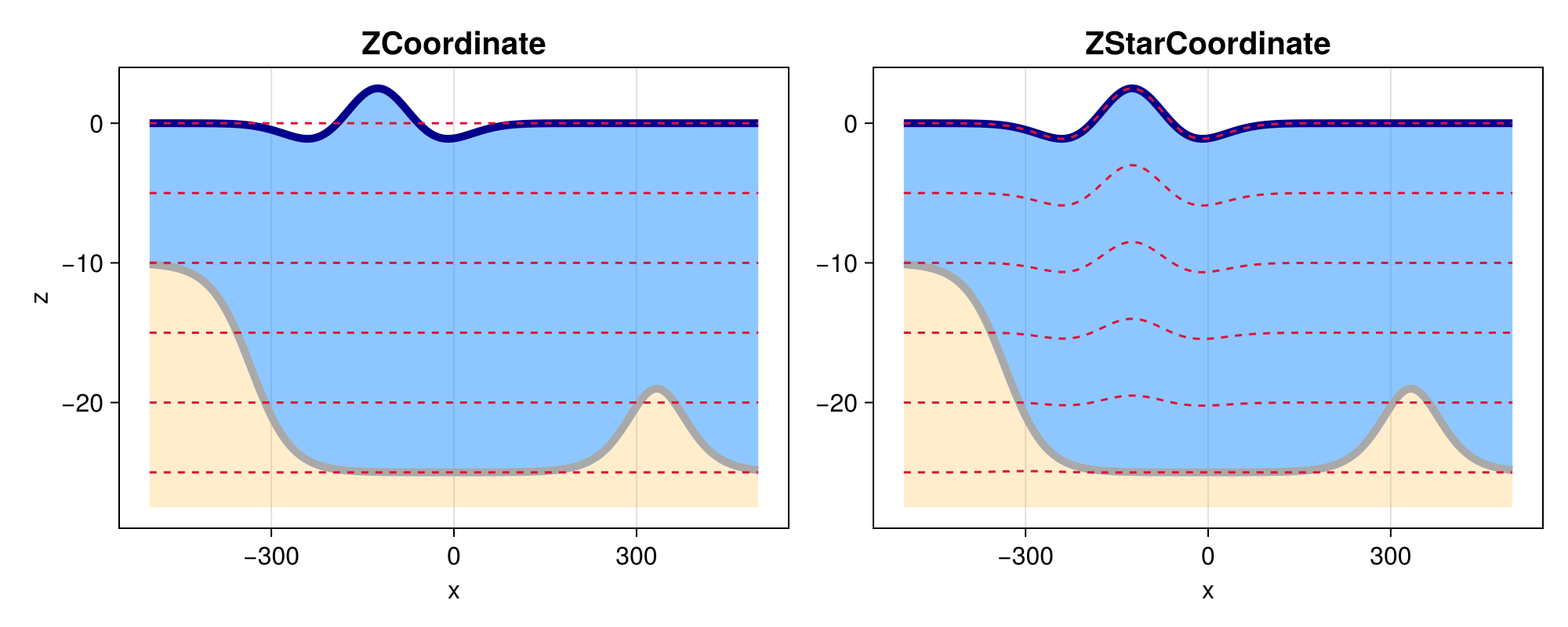 An example of how the vertical coordinate surfaces differ for ZCoordinate and the time-varying ZStarCoordinate coordinate is shown below.