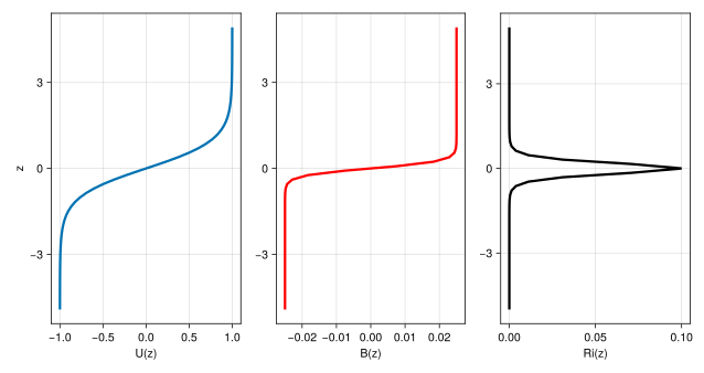 B = BackgroundField(stratification, parameters=(Ri=0.1, h=1/4))BackgroundField{typeof(Main.var"##230".stratification), @NamedTuple{Ri::Float64, h::Float64}}
